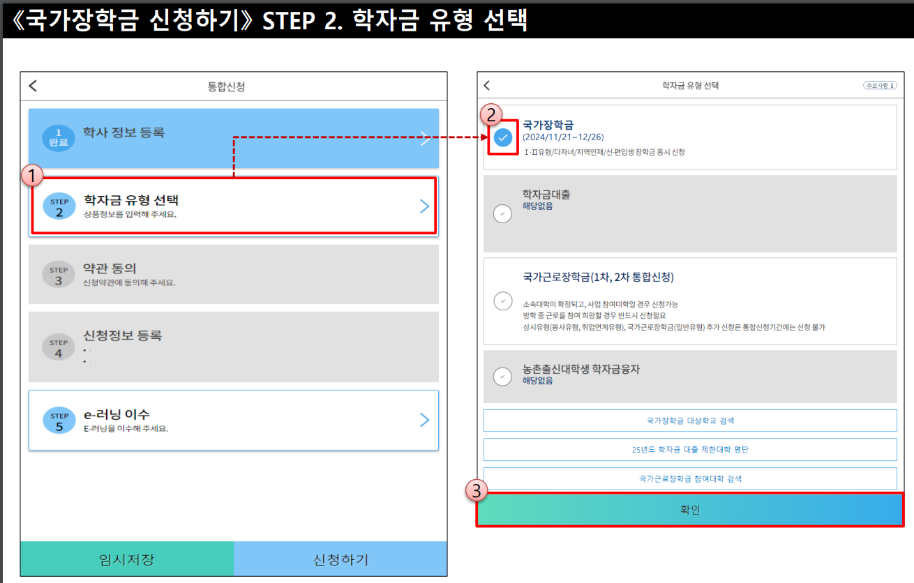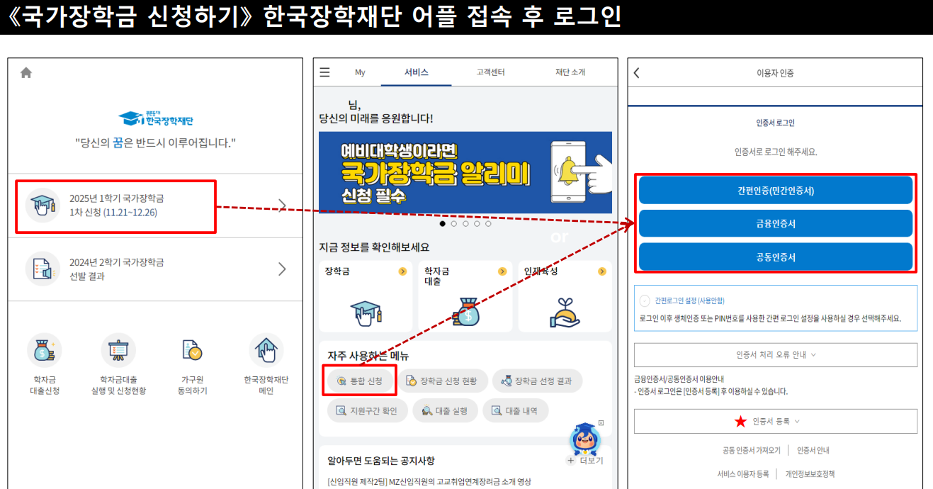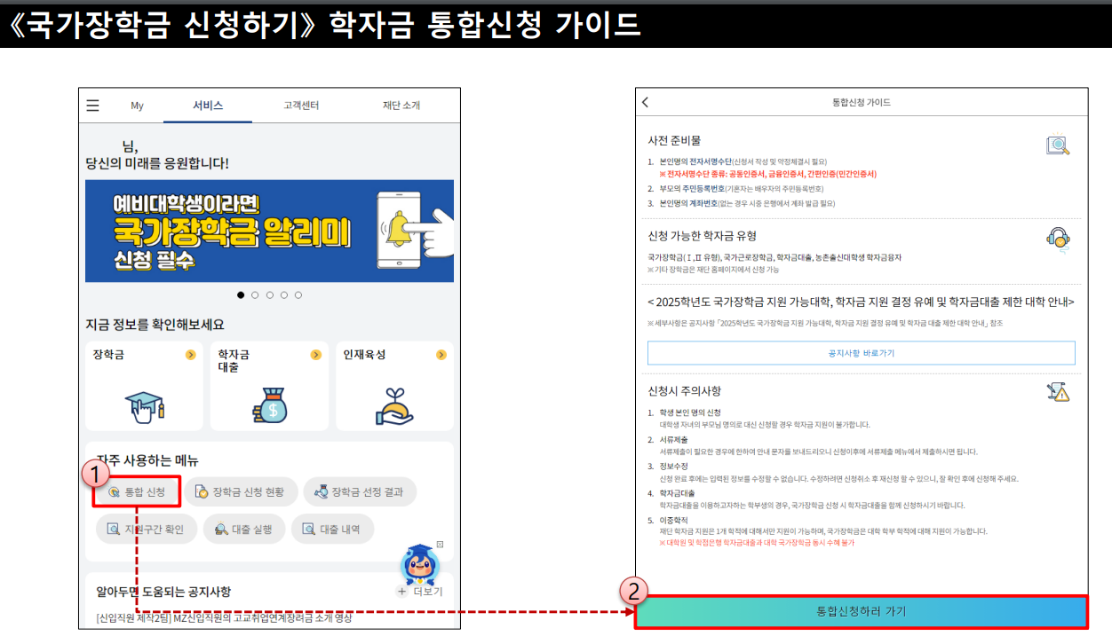 ✅ 신청방법: 한국장학재단 통합신청 어플을 통해 신청이 가능하며 모바일 앱에서도 신청이 가능합니다. (주말, 공휴일 포함 24시 신청 가능)