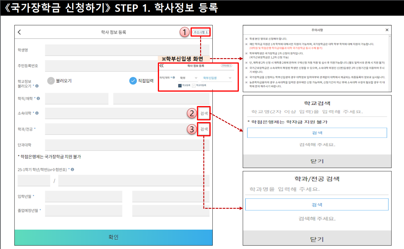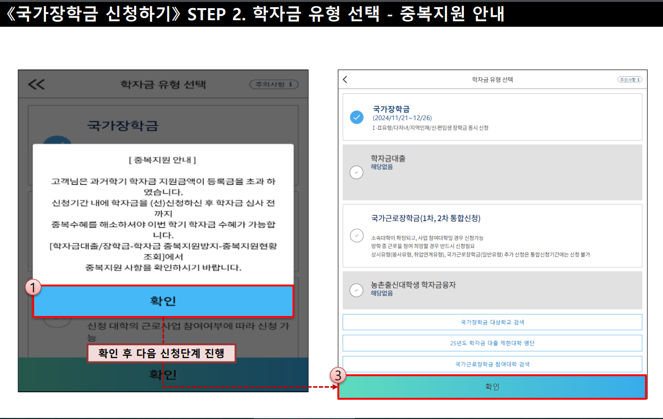 잘못된 대학명으로 신ㄴ청하거나 확정되지 않은 대학으로 신청할 경우 심사가 지연 되거나 국가장학금 수혜 불가 |