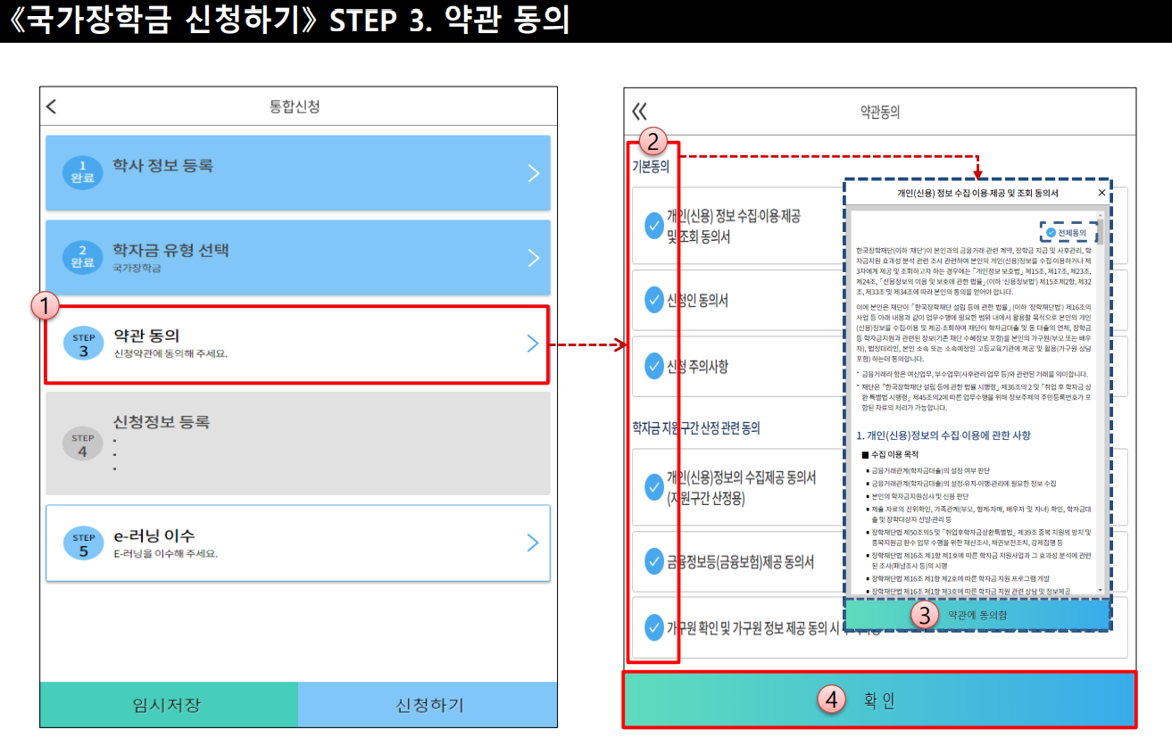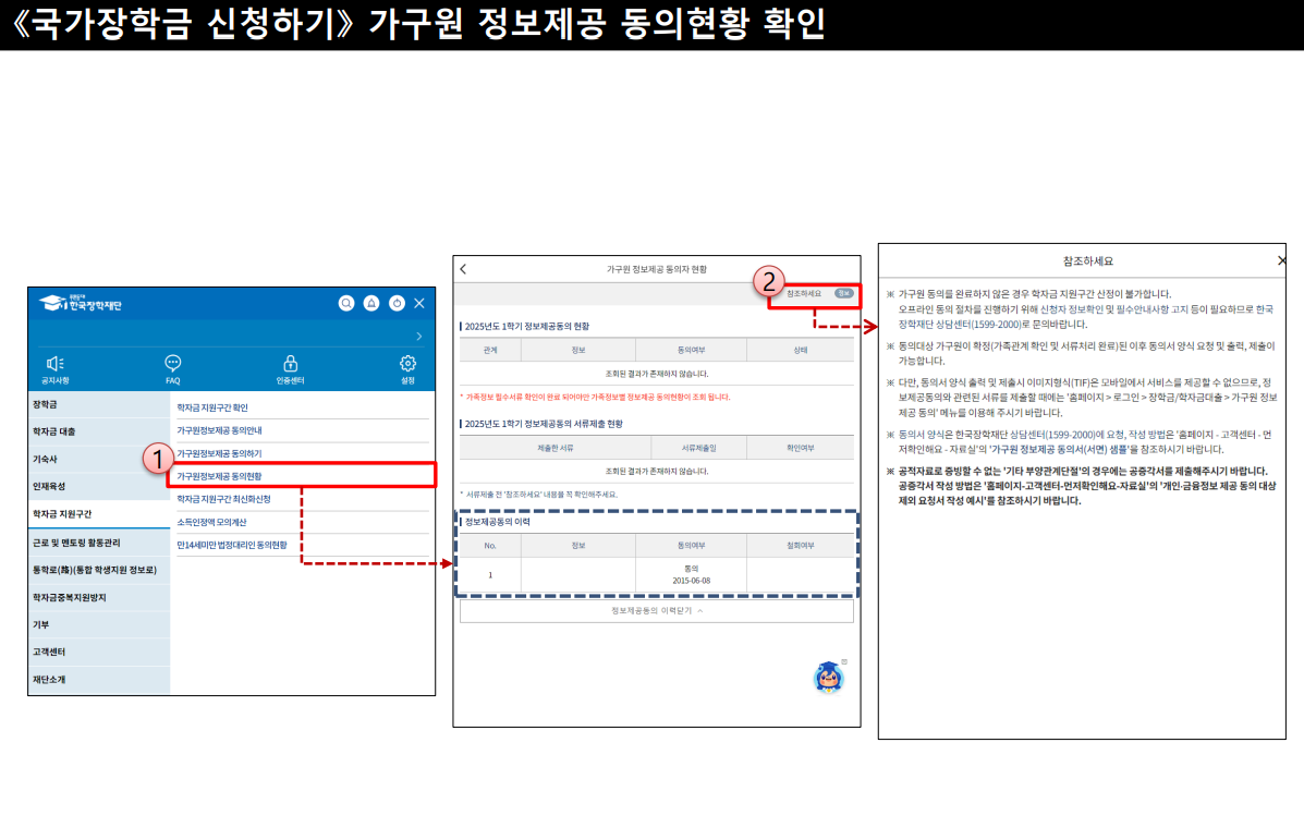 | 가구원 동의 및 서류제출 완료 | 당해하기 가구원 동의 및 서류제출 기한 내 가구원 미동의 또는 증빙서류 미제출(제출대상자의 경우) 시 국가 장학금 지원 불가 |