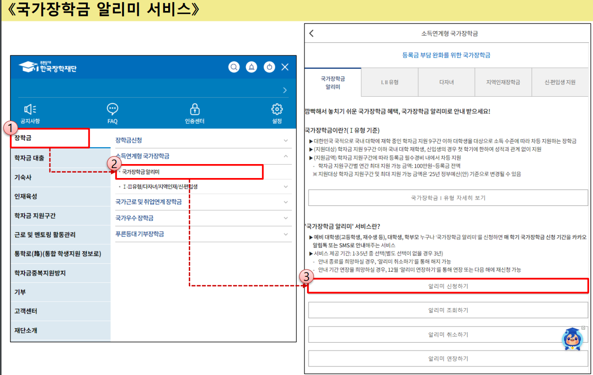 ✅국가장학금 알리미 서비스는 예비대학생, (고등학생, 재수생등), 대학생, 학부모, 누구나 "국가장학금 알리미"를 신청하면 매 학기 국가장학금 신청 기간을 카카오 알림톡 또는 SNS로 안내해 주는 서비스입니다.