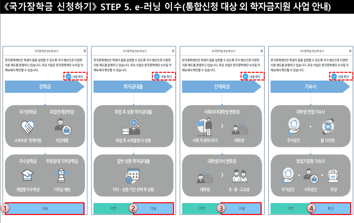 10. e러닝 이수: 국가장학금 사전 체크리스트국가장학금 순서도· 유의사항, 학자금 지원구간 심사안내, 공공재정환수법 안내, 통합신청 대상 외 학자금지원 사업 안내