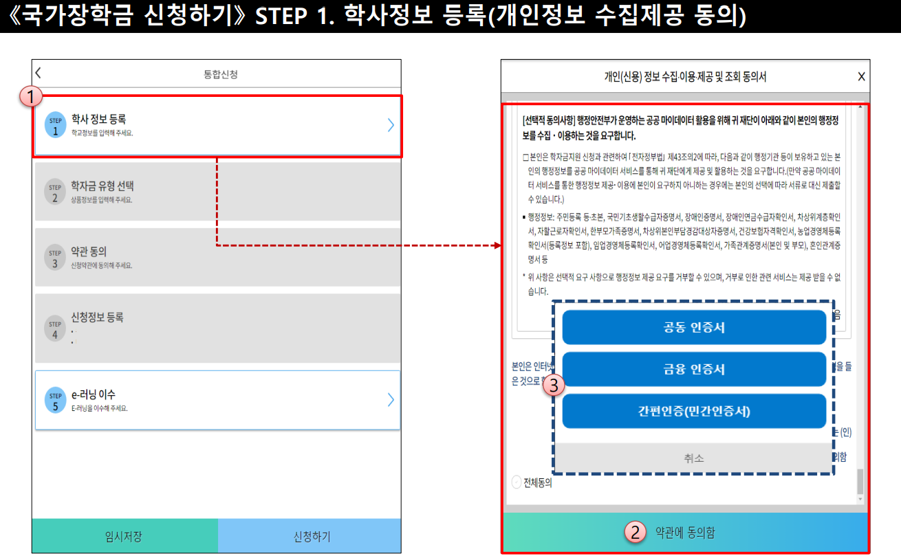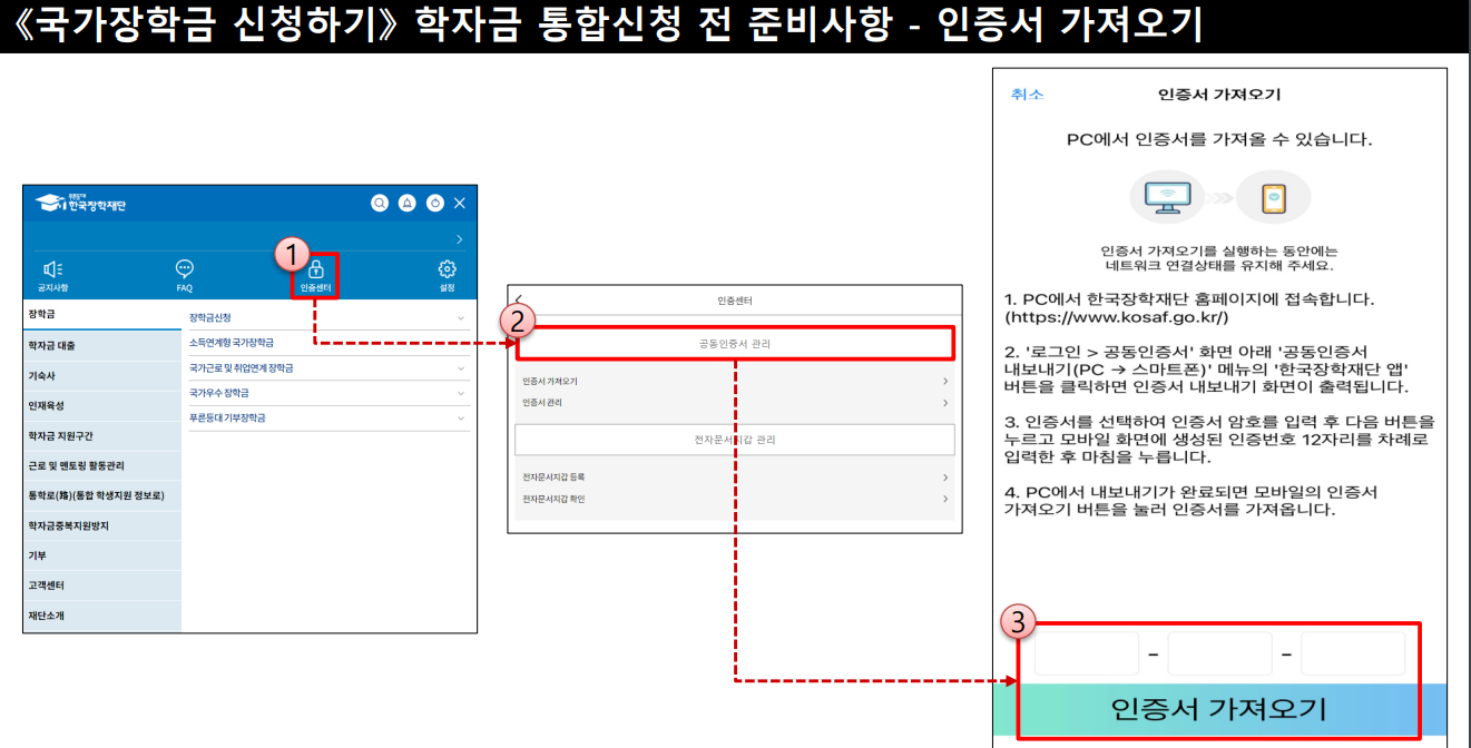 2. 학자금 통합신청 전 준비사항- 인증서 가져오기(본인 공동인증서, 금융인증서, 민간인증서, 부모의 주민등록번호, 본인명의 계좌번호