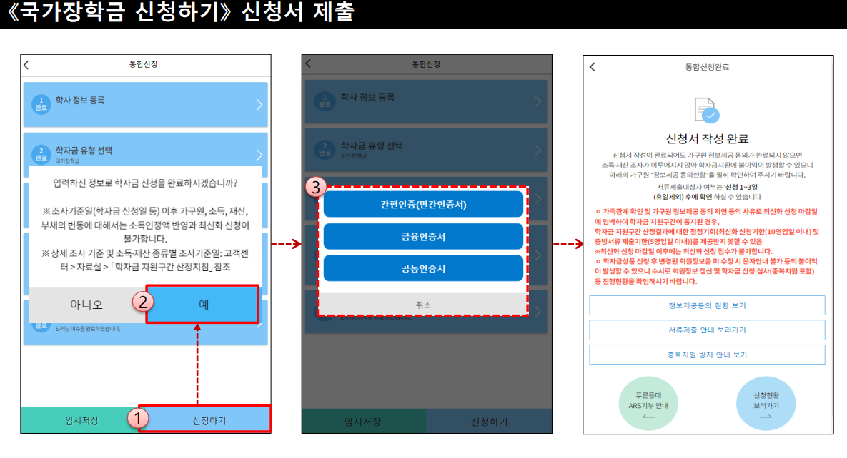 | 공동인증서or 금융인증서 or 민간인증서 발급 후 기한 내 신청 | 마감일에 임박하여 공동인증서or 금융인증서 or 민간인증서 발급 시 기간 내 국가장학금 신청이 불가할 수 있으므로 사전 준비 권장 |