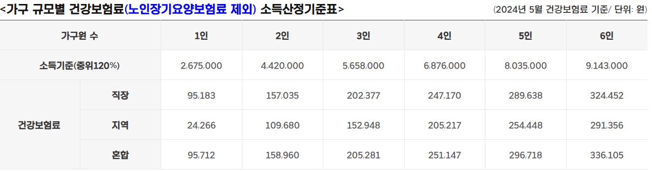 | 소득(건강보험료기준) | 기준중위소득 120% 이하 가구(24년 5월 건강보험료 기준) 총가구원수 :7인가구(청년, 할머니, 부,모, 누나1, 배우자, 자녀) ※ 청년의 건강보험료에 지역가입자인 할머니, 부,모, 누나1, 자녀가 포함되어 있으면 혼합으로 확인 |